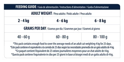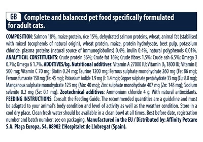 Samenstelling: Zalm (18%), Maïseiwit, rijst (15%), gedehydrateerde zalmeiwitten, tarwe, dierlijk vet, gestabiliseerd met een mengsel van tocoferolen van natuurlijke oorsprong, tarwe-eiwit, maïs, eiwithydrolysaat, bietenpulp, kaliumchloride, plasma-eiwitten, natuurlijke bron van immunoglobulinen (0,4%), inuline (0,4%), natuurlijke polyfenolen (0,01%)