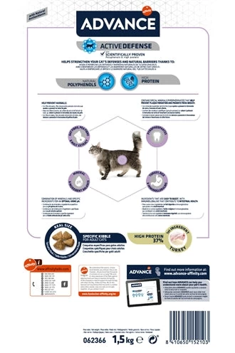 Advance Cat Hairball Turkey / Rice l 1,5 kg is een volledig kattenvoer op basis van kalkoen en rijst speciaal voor katten met haarbalproblemen.