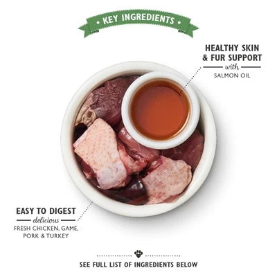 Samenstelling: Kip (25%), Wild (15%), Varkensvlees (15%), Kalkoen (10%). Zalmolie, gechelateerde mineralen, algen.