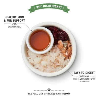 Samenstelling: Zalm (30%), Kip (15%), Varkensvlees (15%), Garnaal (5%), Zalmolie, Gechelateerde mineralen, algen.