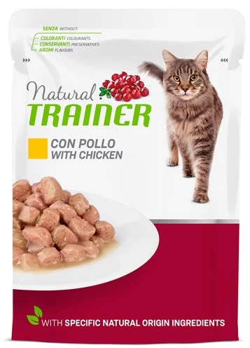 Natural Trainer Cat Adult Chicken Pouch 12 x 85 gr is aanvullend natvoer voor de kat met kip en cranberry in jus voor gezonde urinewegen en blaas.