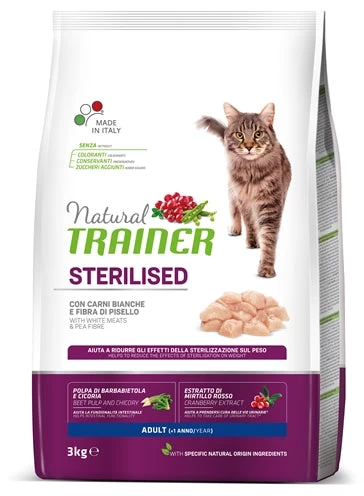 De Natural Trainer Cat Sterilised White Meat 3 kg is een hoogwaardig volledig droogvoer voor volwassen katten vanaf 1 jaar met kip, kalkoen en cranberry voor gezonde urinewegen en een gezond gewicht bij gesteriliseerde katten.