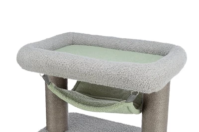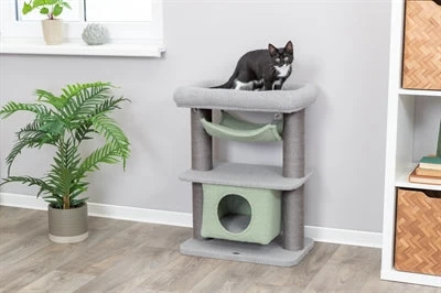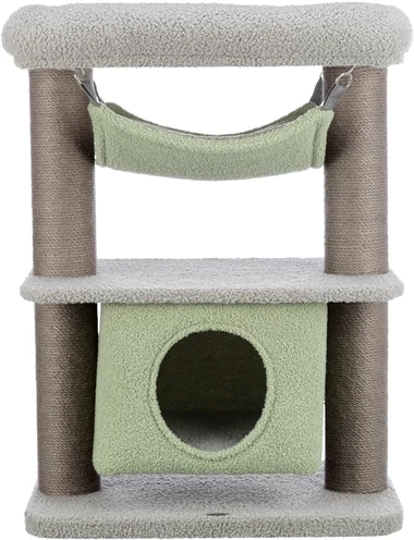 De Trixie Kitten Krabpaal Lunito Grijs/Mintgroen 71 cm is een krabpaal voor kittens in schapenvacht look met schuilplaats, hangmat en twee ligplekken. Krabben is voor katten een natuurlijke bezigheid: zo houden zij hun nagels bij en markeren zij hun territorium. Om te voorkomen dat jouw kitten zijn nagels leert slijpen aan het meubilair, is het aan te raden veel krabmogelijkheden in huis te hebben. Daarvoor is deze handige krabpaal uitermate geschikt! De paal bestaat uit een schuilplaats, twee ligplateaus, een hangmat en twee palen met sisal om de nagels aan te scherpen. De hangmat is verwijderbaar en kan op de hand gewassen kan worden.