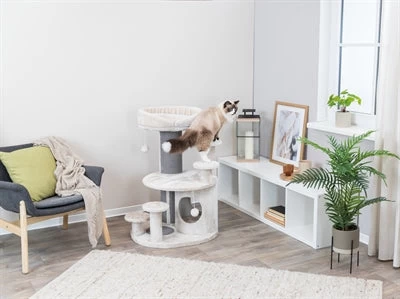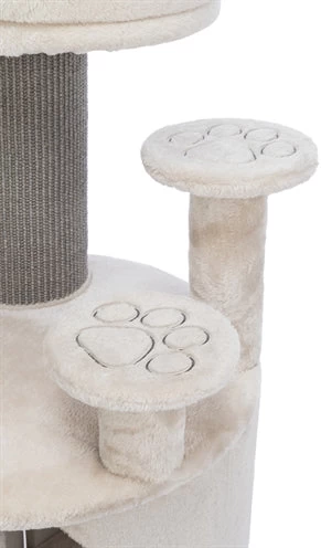De Trixie Krabpaal Emil Lichtgrijs 69 x 59 x 96 cm is een uitgebreide maar toch compacte krabpaal voor de kat, met relax-mand en schuilhuisje met vitaal kussens die zorgen voor optimale drukverdeling. Krabben is een natuurlijke behoefte van de kat. Hiermee onderhoudt de kat zijn nagels en markeert hij zijn territorium. Biedt jouw kat daarom voldoende krabmogelijkheid, zoals met deze mooie krabpaal van Trixie. Deze krabpaal heeft een stam omwikkeld met sisal om aan te krabben, krabvlak op de bodem en is daarnaast uitgerust met een schuilplaats bekleed met pluche/fleece. De schuilplaats is voorzien van een vitaal kussen met visco-elastisch schuim dat zich aan de lichaamsvorm aanpast, net als het gevoerde ligplateau bovenop. Deze kussen zorgen voor optimale drukverdeling en daardoor beter slapen en soepeler opstaan. Voor goede bereikbaarheid van het ligplateau is de krabpaal uitgerust met opstaphulpjes. De stevige, massieve bodemplaat zorgt voor veel stabiliteit. Een krabpaal met veel mogelijkheden die toch compact is en daarmee ook geschikt voor kleine ruimtes.
